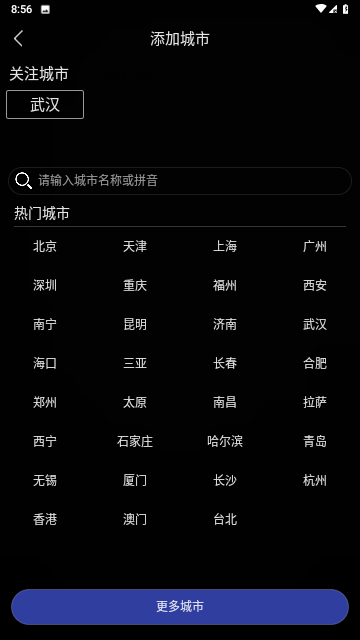 进入后用户可以选择打开定位功能,让app自动定位你所在的城市,也可以选择输入地区手动添加。