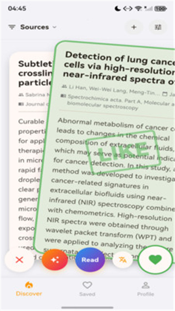 1、通过左滑右滑操作,快速切换卡片,点击文献详情可查看完整摘要。