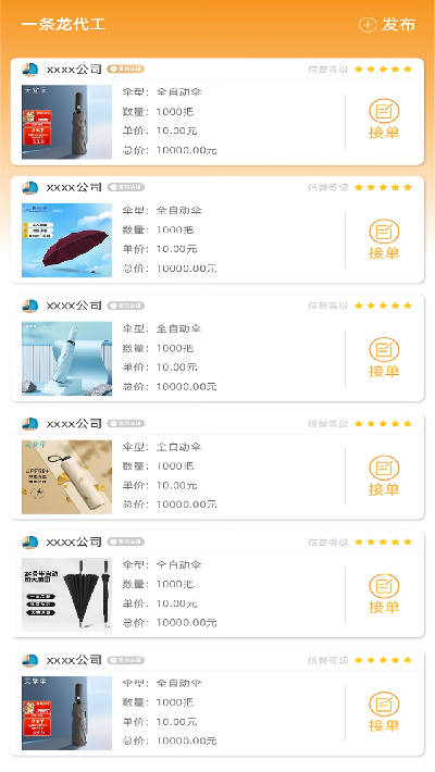 1.代生产订单对接:支持用户发布制伞代生产需求,一键匹配加工厂、企业等代工资源,完成全流程代工服务。