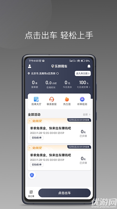 4.开始接单:点击“出车”按钮进入听单状态,收到订单后查看详情并一键确认,根据导航前往接人。
